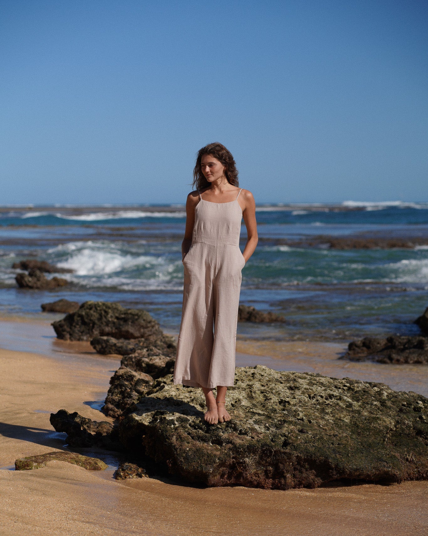 Isabella V. Jumpsuit is such a stunning option for both day and evening wear. Stylish and breathable linen brings a sense of movement to our jumpsuit, which is simple and affectionate. It features a flattering square neckline and gathers at the waist before falling to wide pants. It has adjustable straps and elastic at the back to customize the fit. It turns to reveal a stunning open back.