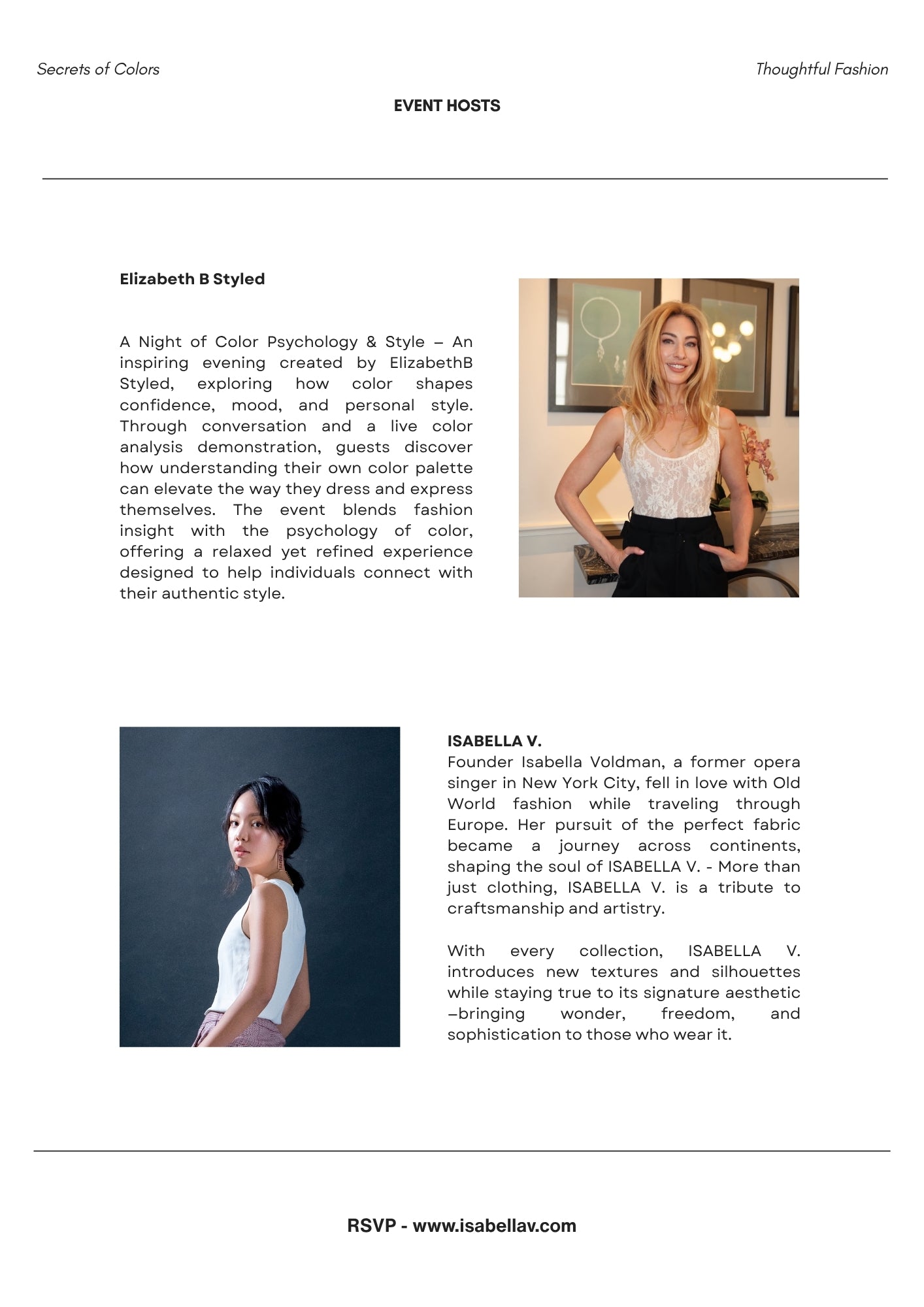Join Elizabeth, the London-based stylist, in collaboration with ISABELLA V., for an intimate and inspiring afternoon celebrating the art of color and timeless elegance.